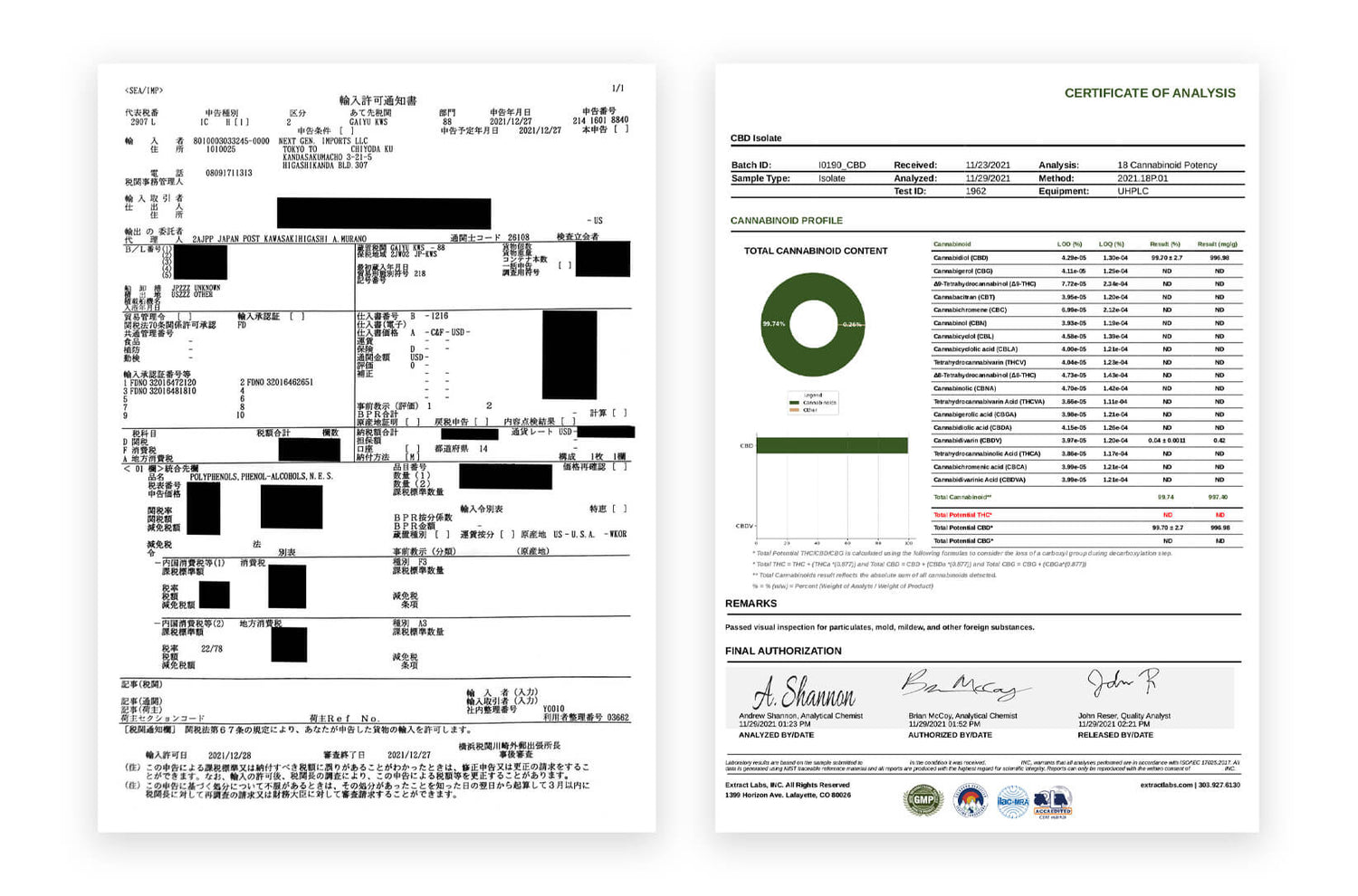 安心してご使用いただくため、CBD原料輸入元からは分析証明書の提出を受け、また日本税関にも輸入通知許可書をいただいております。